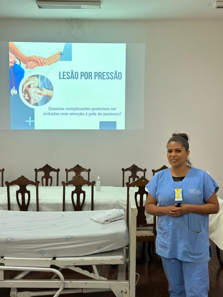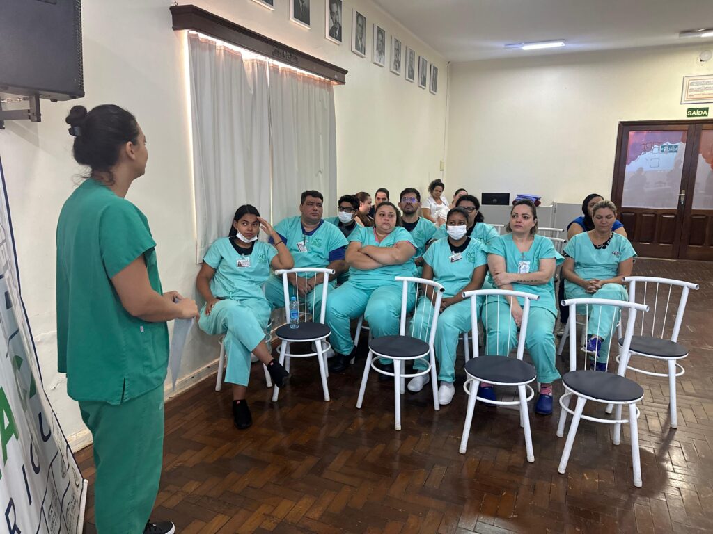 Na terça-feira (16), Camila Mantovan, da CCIH, destacou a importância da Higienização das Mãos. A equipe de farmácia abordou o uso correto de medicamentos, enquanto as unidades UE1 masculina e feminina discutiram sobre Lesão por Pressão. Na sequência, a equipe da UTI apresentou o tema Identificação de Pacientes e a equipe da maternidade falou sobre os cuidados com o recém-nascido.