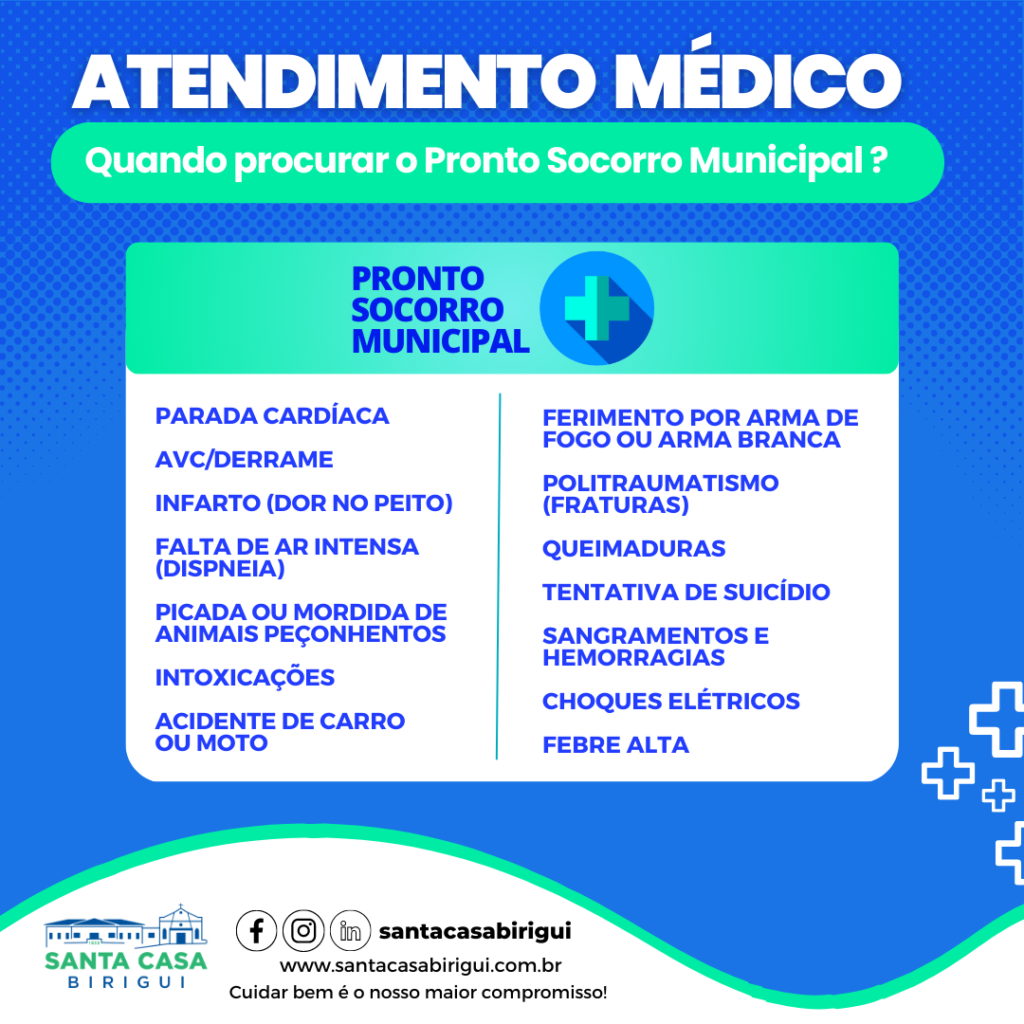Já o Pronto Socorro funciona 24 horas por dia, sete dias por semana, sendo responsável pelos atendimentos de urgência (situação que requer assistência rápida, a fim de evitar complicações) e emergência (quando há ameaça iminente à vida, havendo necessidade de tratamento médico imediato).
